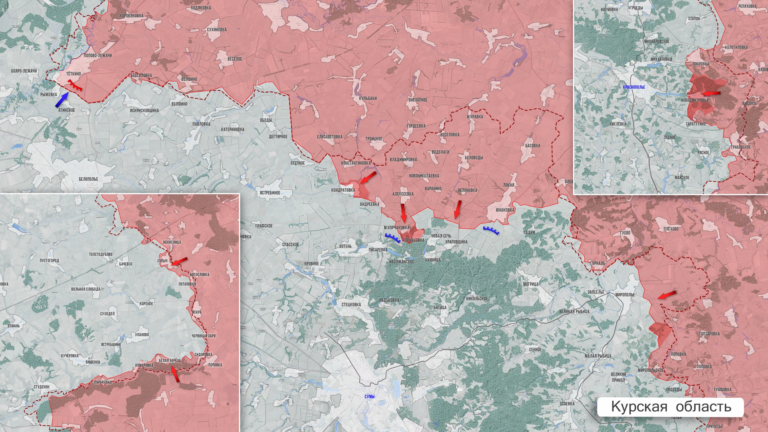 В Сумском приграничье МО РФ сообщило об освобождении Корчаковки, бои за которую шли месяц. Для преодоления мощного рубежа обороны на пути к Сумам нашим предстоит освободить Новую Сечь и Хараповщину. В районе Краснополья продолжаются бои на подступах к Михайловке. У Новодмитровки и Таратутино ВС РФ укрепляют занятые ранее позиции.