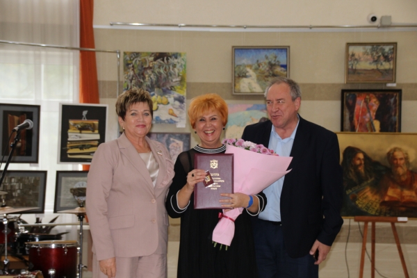 От имени главы крымского парламента Владимира Константинова Алла Пономаренко передала директору библиотеки грамоту Государственного Совета Республики Крым с вручением нагрудного знака.