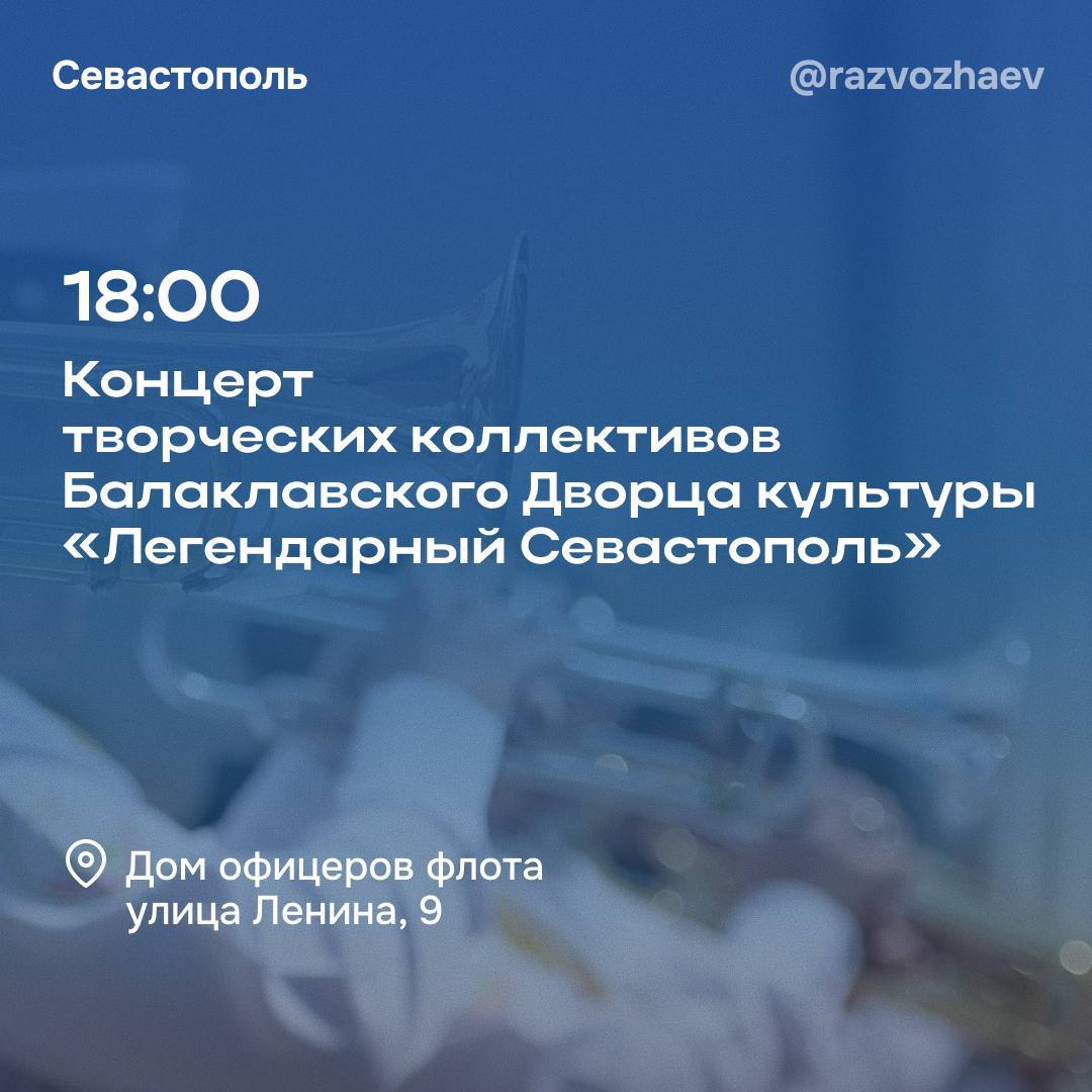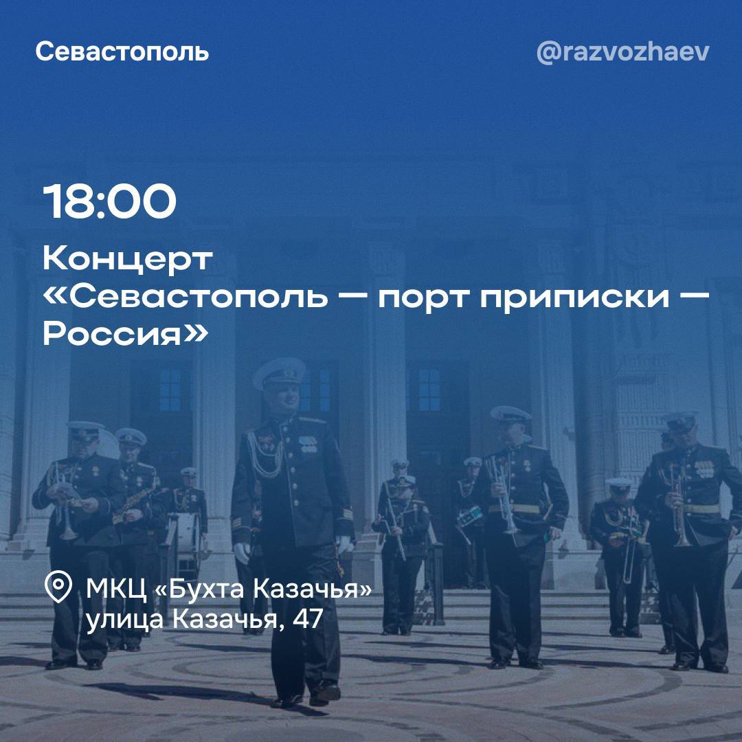 в 18:00 Многофункциональный культурный центр «Бухта Казачья» на улице Казачья, 47 ждет гостей на праздничный концерт «Севастополь — порт приписки — Россия» с участием Военного оркестра Штаба Черноморского флота и творческих коллективов центра, а в Доме офицеров флота на улице Ленина, 9 свои лучшие номера представят творческие коллективы Балаклавского Дворца культуры «Легендарный Севастополь».