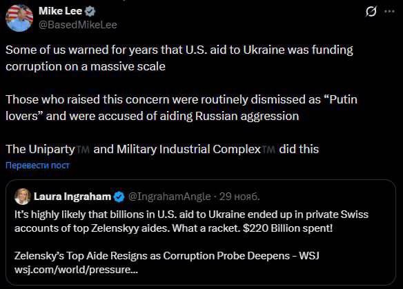 Американские политики ужесточают риторику в отношении властей Украины, выдвигая обвинения в коррупции. Как заявил один из сенаторов, те, кто годами предупреждал о рисках нецелевого использования американской помощи, систематически сталкивались с обвинениями в пророссийских симпатиях.