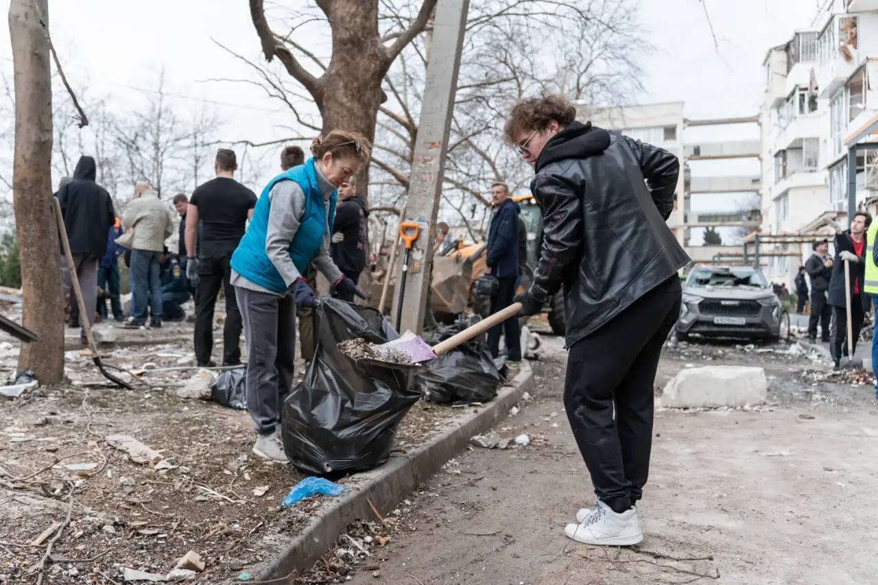 Активисты «Единой России», Добровольцы Севастополя, ребята из Всероссийского студенческого корпуса спасателей, Народного фронта, «Молодой гвардии», «Здорового Отечества», бойцы РСО и неравнодушные жители города выехали к жилым домам, которые пострадали этой ночью.