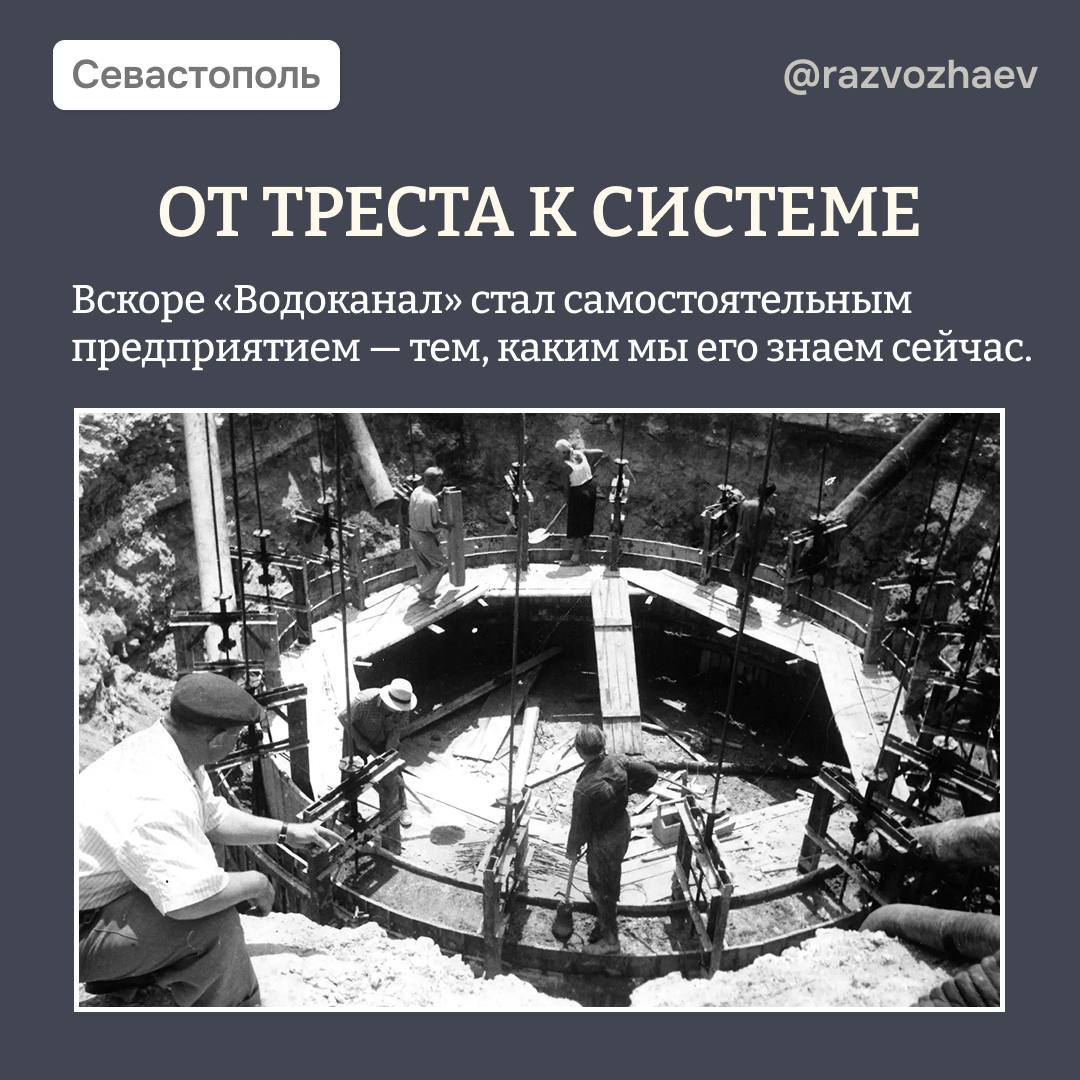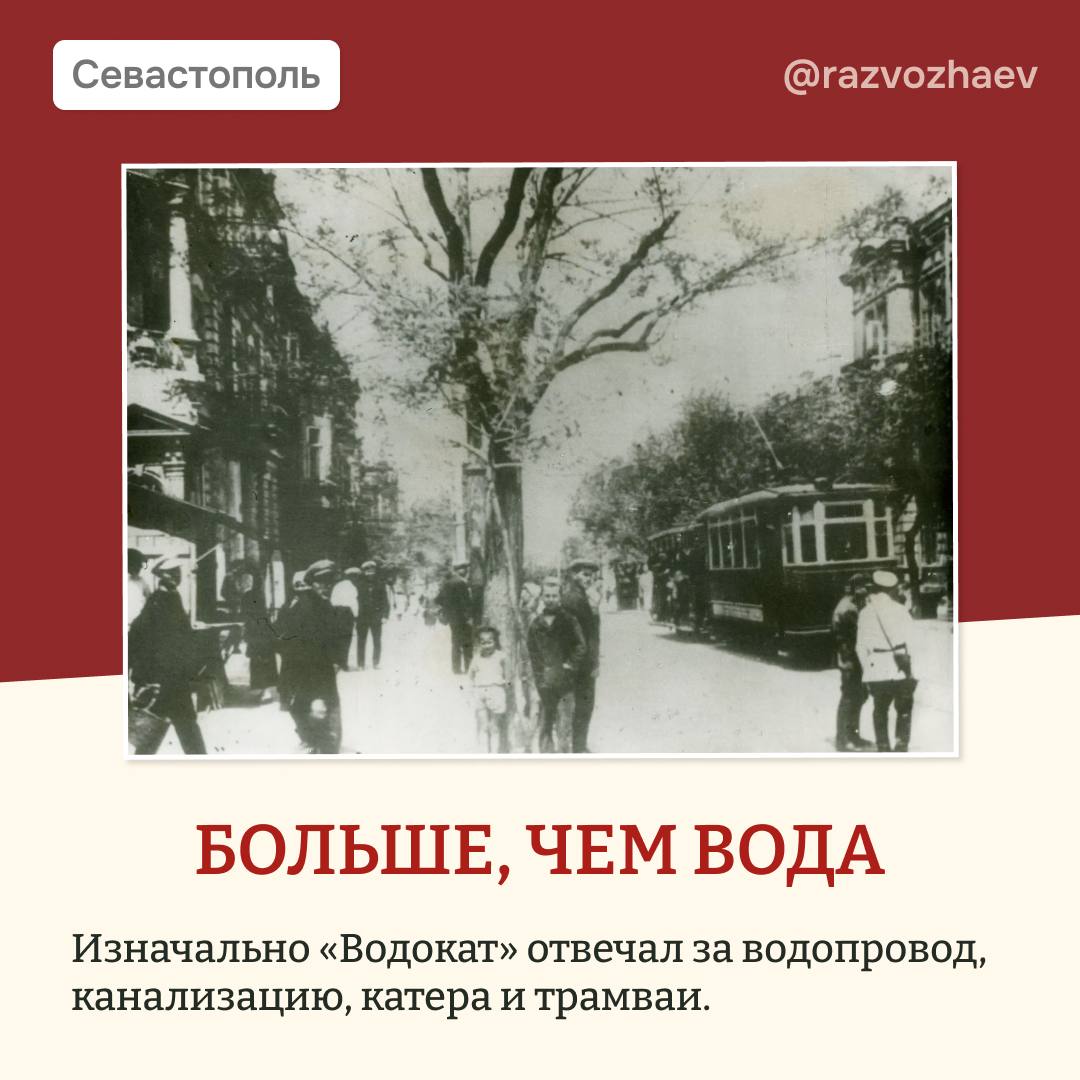 1 апреля 1925 года в городе появился коммунальный трест «Водокат». В его ведении, помимо водопровода и канализации, были катера и трамваи, ходившие тогда в Севастополе. Спустя время предприятие получило новое название «Водоканал» и стало отвечать конкретно за водоснабжение и водоотведение.