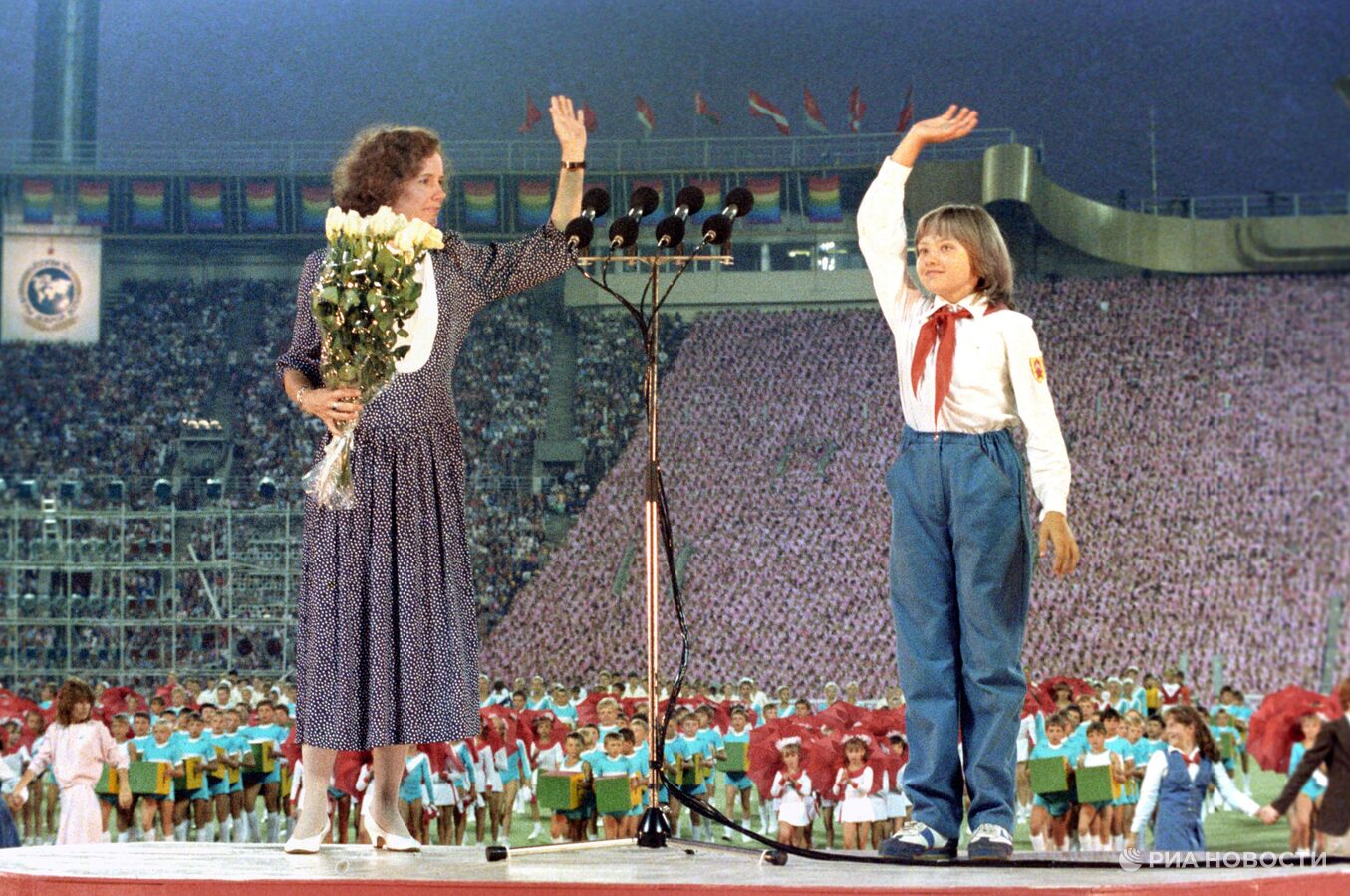 Мать погибшей американской девочки Саманты (посол мира из США) Джейн Смит и московская школьница Катя Лычева на торжественной церемонии открытия первых Игр доброй воли (с 5 по 20 июля 1986 года). Центральный стадион имени В.И. Ленина (ныне Олимпийский комплекс "Лужники")