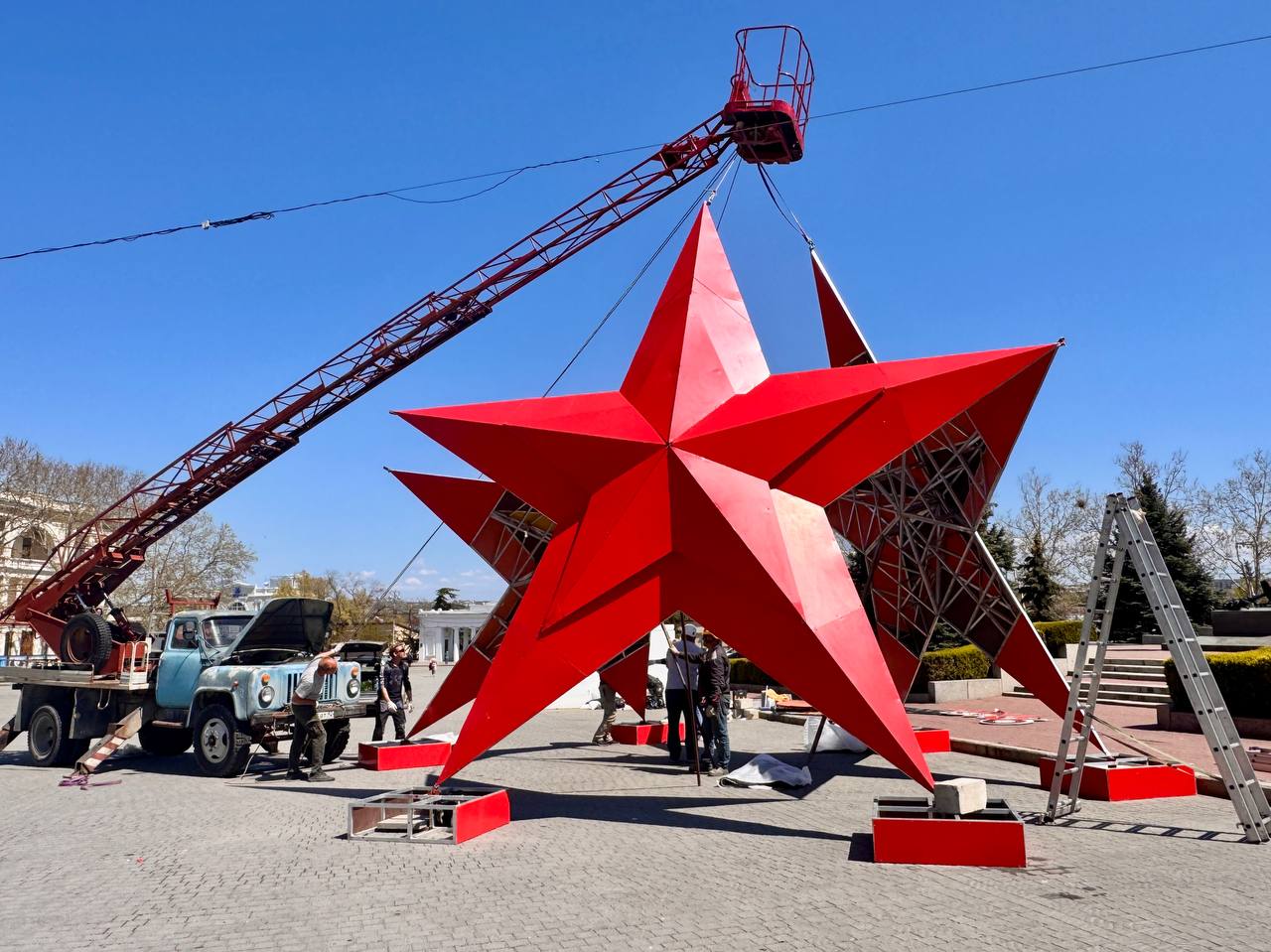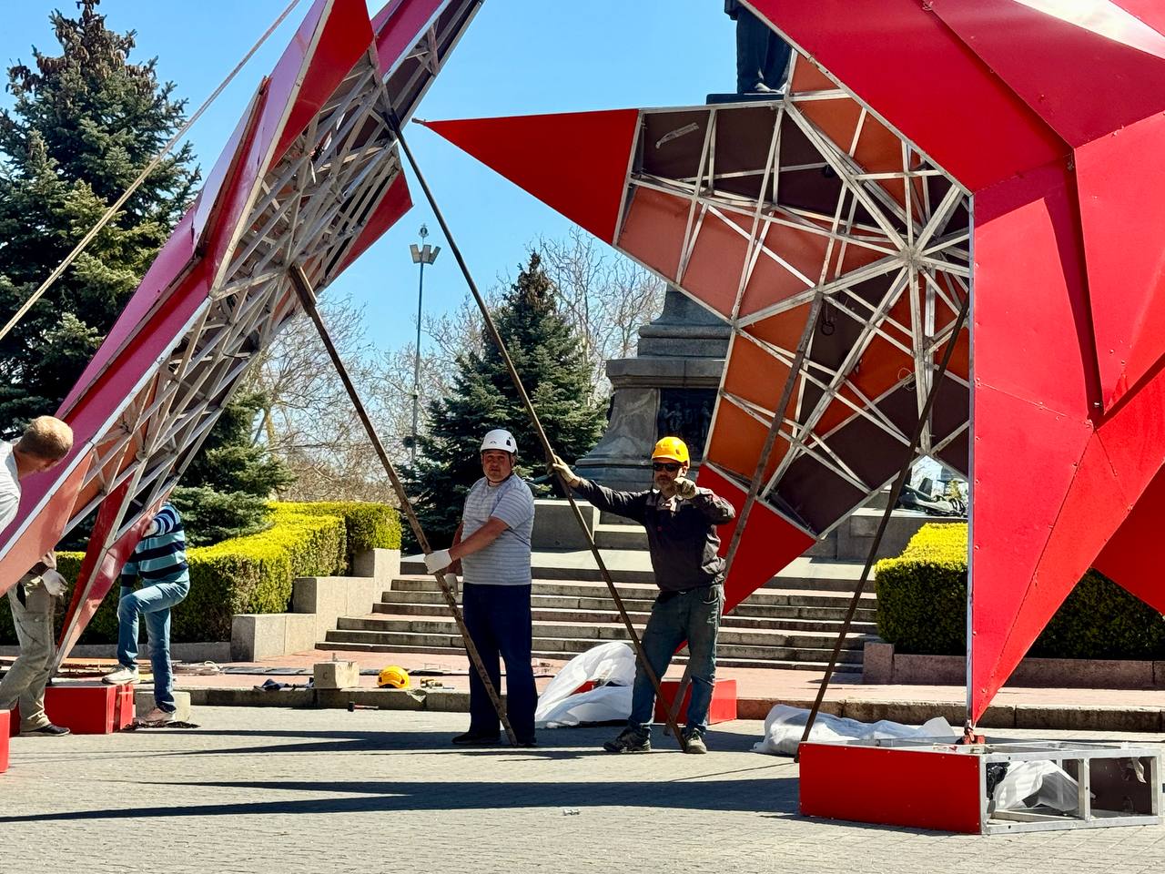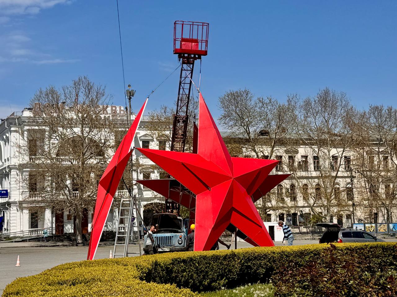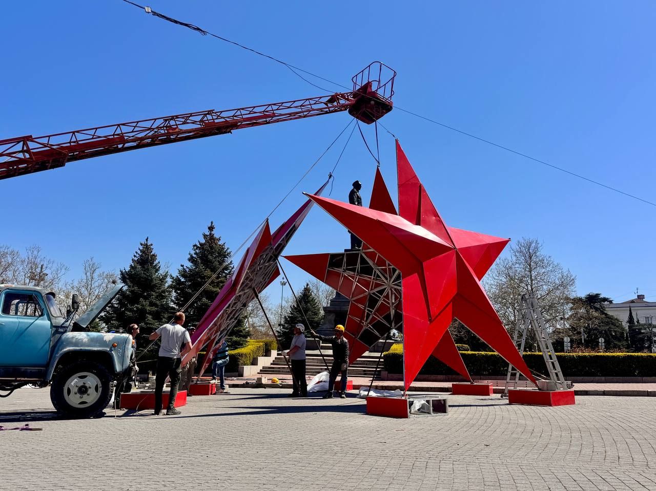 Сегодня специалисты монтируют звёздный павильон на площади Нахимова. Праздничные инсталляции уже установили на площади Ушакова, на Приморском бульваре, в парке Победы.