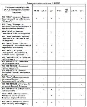 Уважаемые жители и гости Джанкойского района!Делюсь с вами актуальной информацией о наличии топлива на АЗС Джанкойского района по состоянию на 21.10.2025 на 09:00