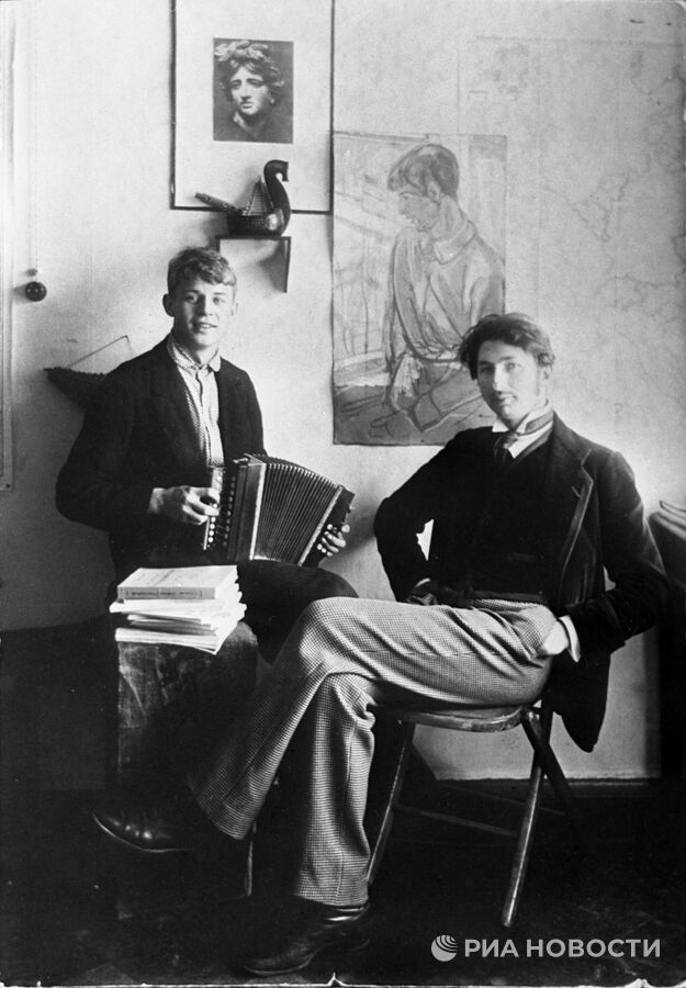Русские поэты Сергей Есенин (слева) и Сергей Городецкий. 1914 г.