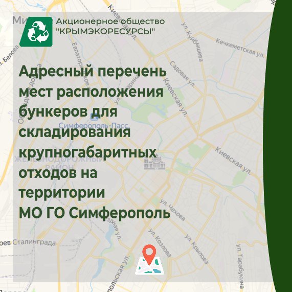 Вывоз крупногабаритных отходов с территории ГО Симферополь осуществляется ежедневно в соответствии с утвержденным графиком. Обращаем внимание, что бункеры-накопители типа «лодка» не предусматривают складирования автомобильных шин, компьютерной техники, строительных материалов от капремонта жилых помещений, растительных остатков. К крупногабаритным отходам (КГО) относятся: старая мебель, матрацы, отходы текущего ремонта жилых помещений: двери, оконные рамы. Их необходимо помещать вбункер в разобранном виде! Перечень мест расположения бункеров-накопителей в Симферополе размещен на сайте АО «Крымэкоресурсы» по ссылке: https://crimea-ecor.ru/press-tsentr/novosti/adresa-raspolozheniya-bunkerov-v-simferopole