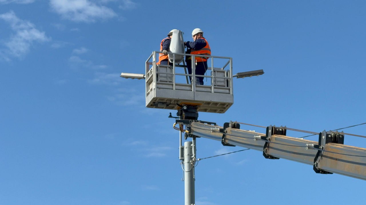 На транспортных кольцах у автовокзала и в районе Марат мастера меняют вышедшие из строя светильники. Для работ задействована специализированная вышка Службы городского хозяйства, высота которой позволяет обслуживать источники света с проезжей части, не въезжая на сами кольца и не повреждая озеленение.
