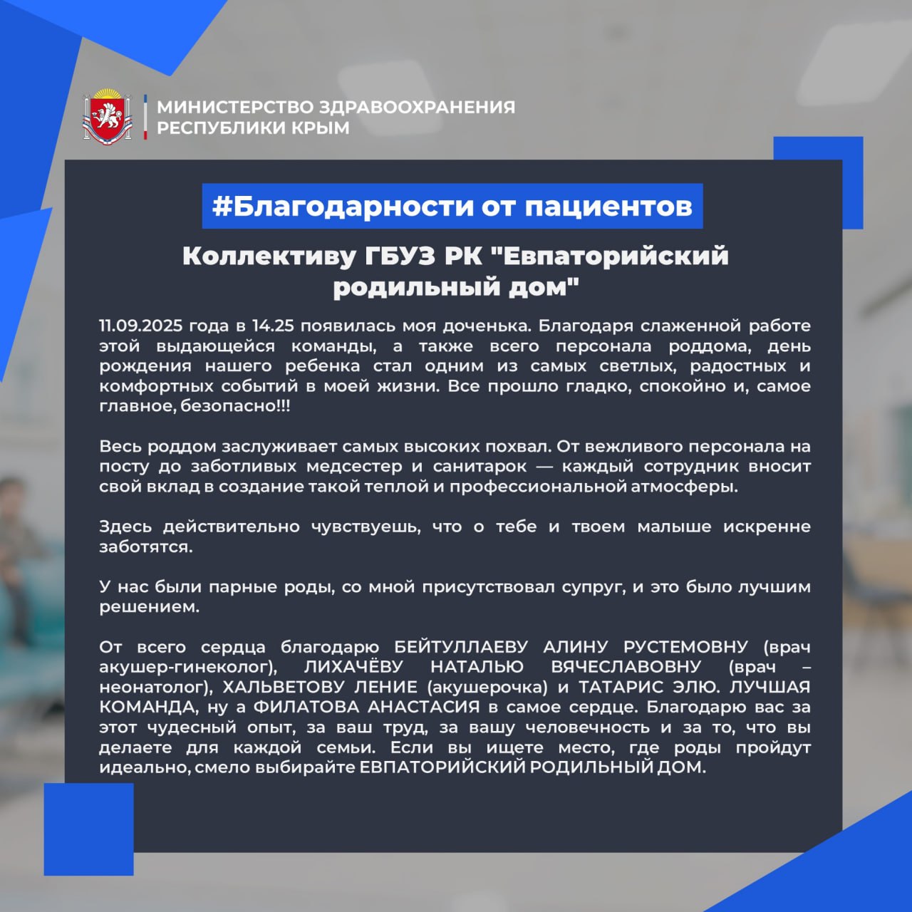 Напоминаем, что для того, чтобы ваша благодарность медикам была опубликована на сайте и в социальных сетях Минздрава Республики Крым, следует направить ее на адрес электронной почты press.mzrk@mzdrav.rk.gov.ru