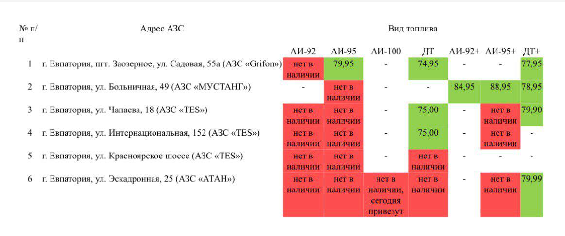 Публикуем актуальные данные о наличии топлива на АЗС Евпатории на 14:00 4 октября 2025 года.