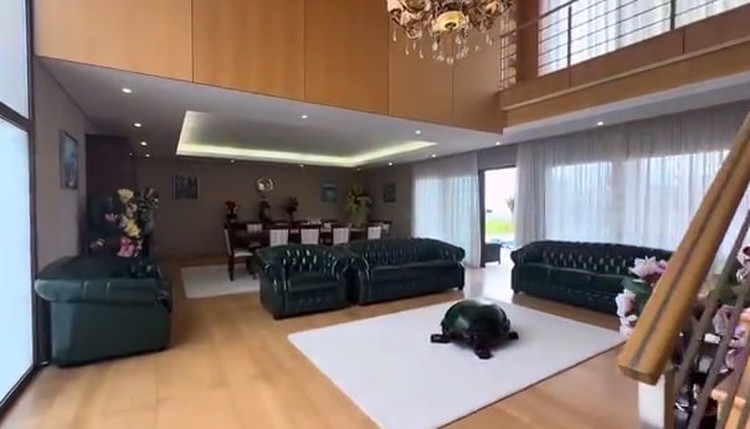 Есть две кухни, величественный обеденный зал, где много подсветки и огромные окна. Часть мебели темно-зеленого цвета – это любимый цвет Олега Зубкова.