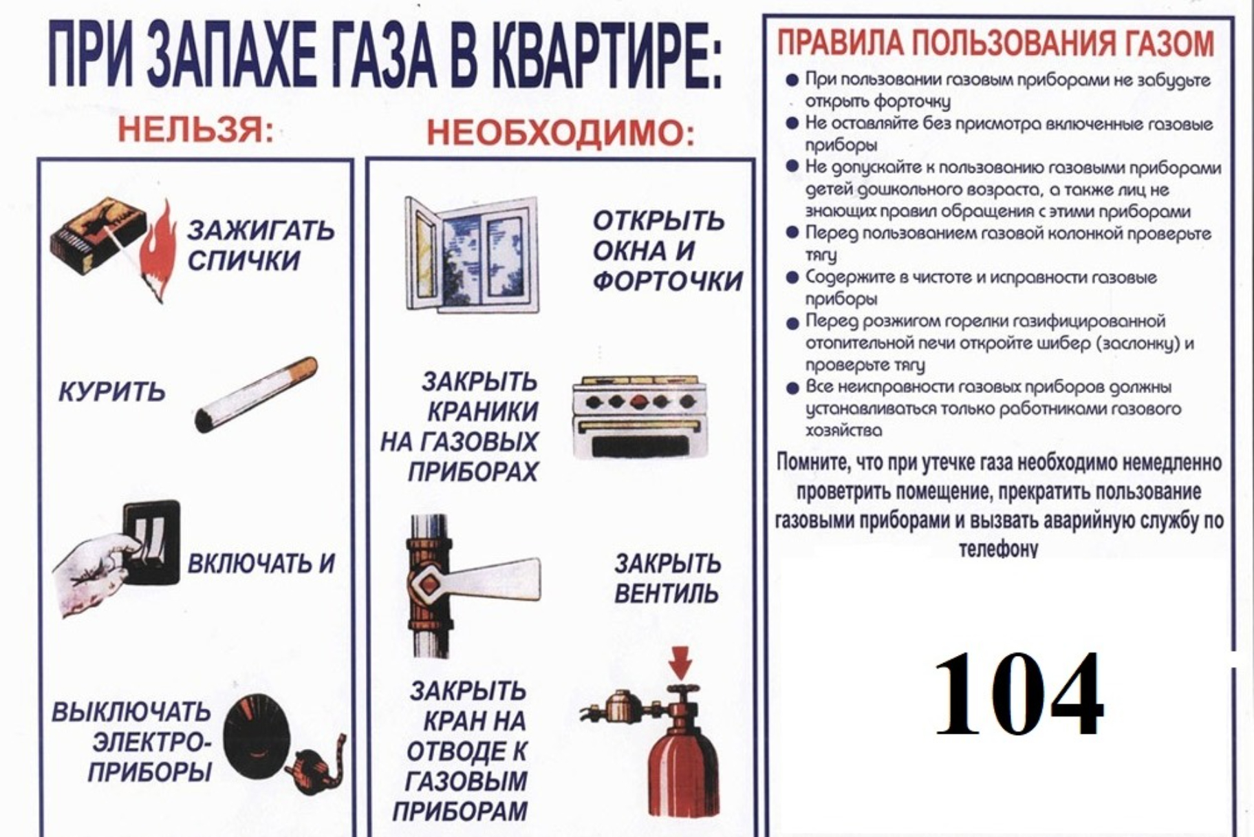 1. При обнаружении запаха газа в помещении необходимо немедленно перекрыть краны на опуске к приборам и на приборах, открыть окно и двери, создать сквозняк, вызвать аварийные службу по телефону 104. Не зажигать огня, не курить, не включать электроосвещение и электроприборы, не пользоваться электрозвонками, принять меры по удалению людей из загазованной зоны.