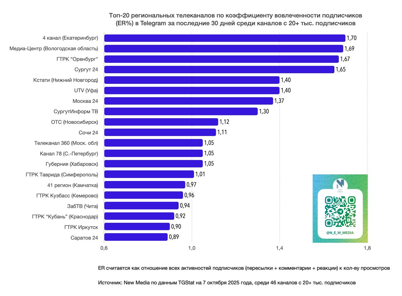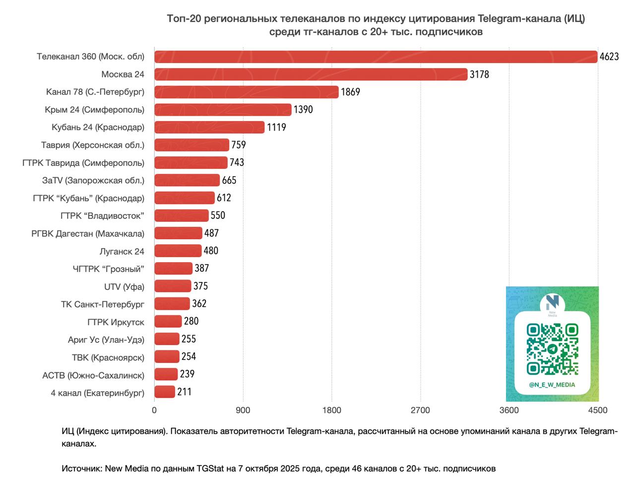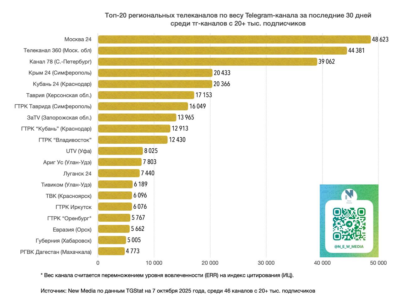Информацию предоставил New Media по данным TGStat на 7 октября 2025 года, среди 46 тг-каналов с 20+ тыс. подписчиков.