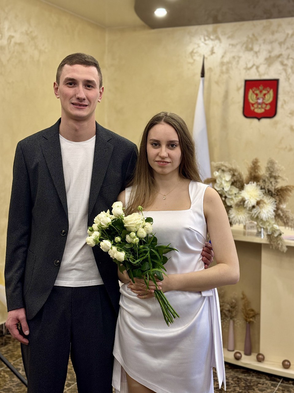 Сотрудники отдела торжественно поздравили новобрачных Дмитрия и Валерию с рождением их семьи, вручили свидетельство о заключении брака и напомнили, что улыбка — это не просто жест, а настоящая поддержка и оберег на жизненном пути супругов.