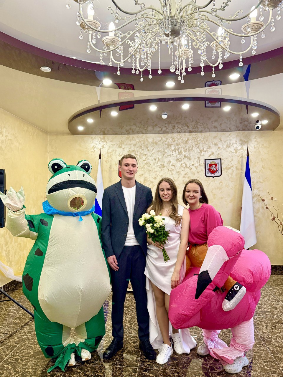 Изюминкой торжества стали необычные гости — в зал отдела ЗАГС вошли персонажи в ярких костюмах лягушки и розового фламинго. Их появление внесло в церемонию нотку иронии и творческого озорства, а сама церемония показала, что любовь — не только серьёзный союз, но и источник радости, вдохновения и света.