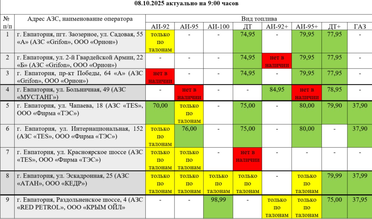 Публикуем актуальные данные о наличии топлива на АЗС Евпатории на 09:00 8 октября 2025 года