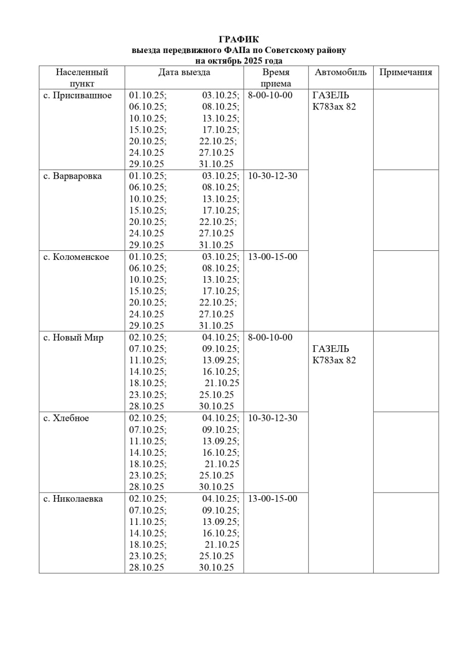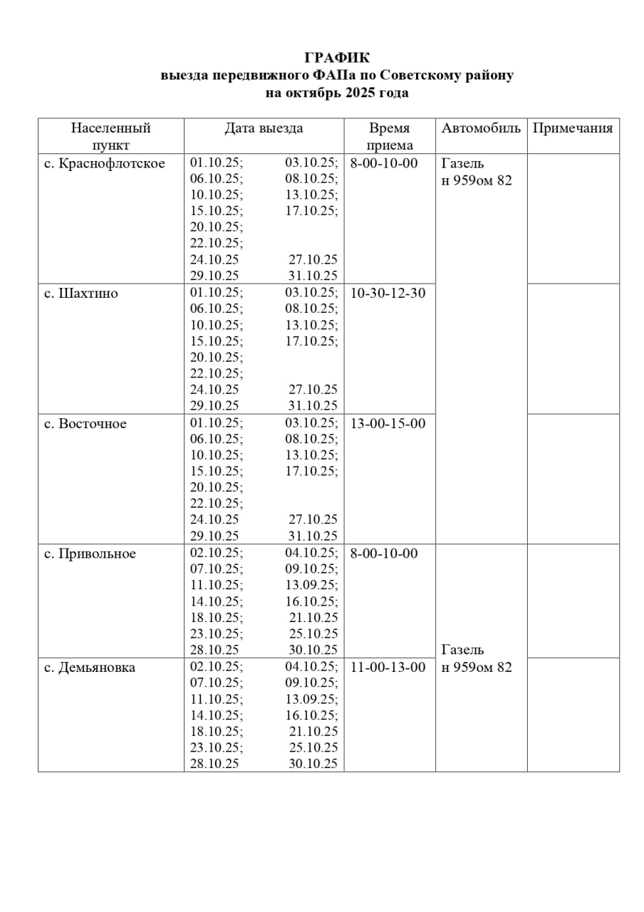 График работы выездного ФАПа на территории Советского района Республики Крым.
