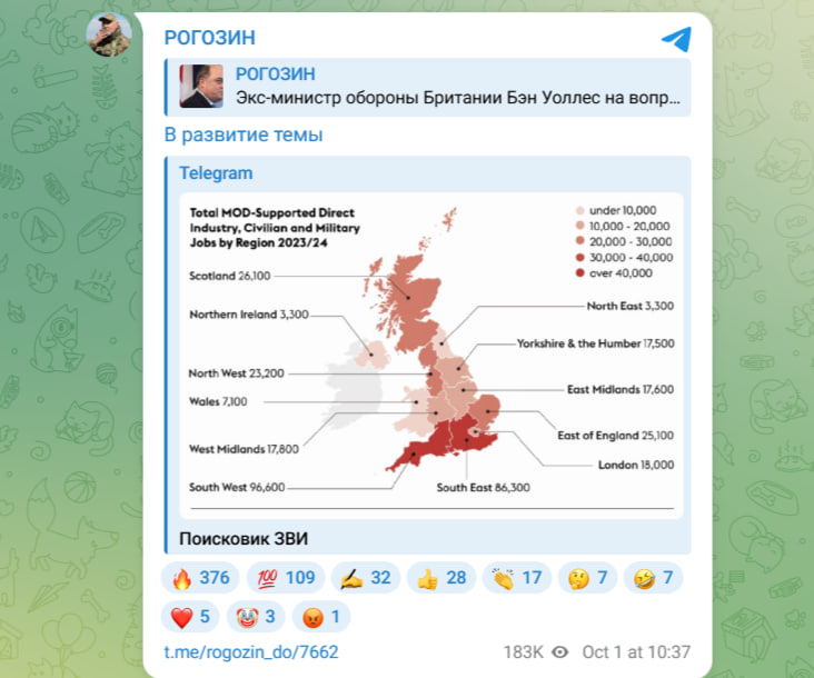 — написал Рогозин в своём телеграм-канале, приложив карту с 23 потенциальными целями на территории Британии.