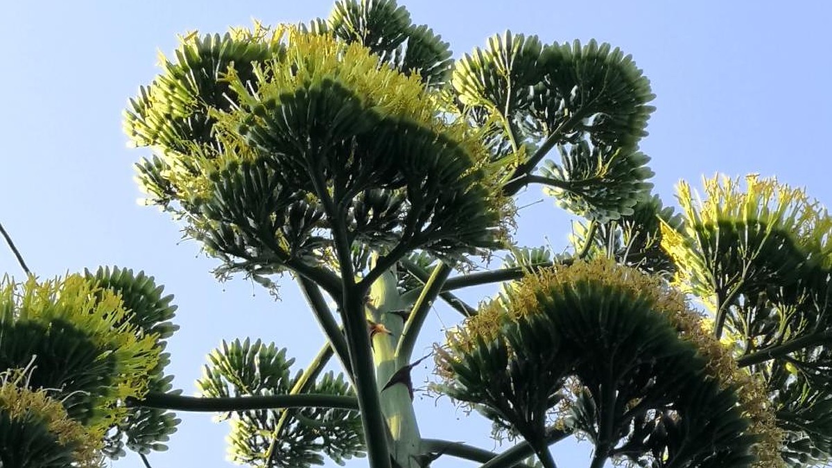 Эксперт предположил, что такое высокое соцветие нужно для того, чтобы семена могли распространяться как можно дальше от материнского растения. Ведь вокруг него к моменту цветения и так уже подрастает следующее поколение. Именно это и происходит в Алуште, где вокруг отцветших экзотиков сформировались малыши.