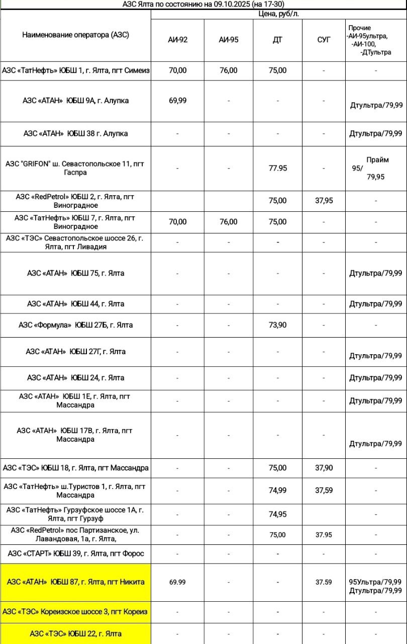Актуальные данные о наличии топлива на АЗС Ялтинского региона на 17:30, 9 октября