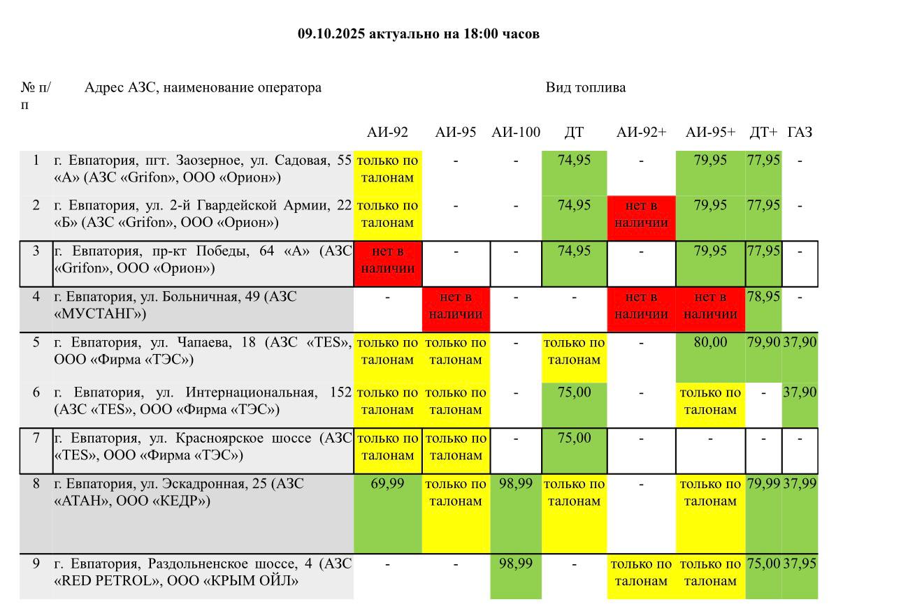 Публикуем актуальные данные о наличии топлива на АЗС Евпатории на 18:00 9 октября 2025 года.