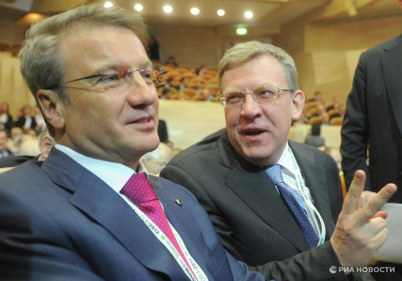 Президент, председатель правления ОАО "Сбербанк России" Герман Греф и российский государственный деятель Алексей Кудрин (слева направо) на инвестиционном форуме "Россия-2012". Оба начали карьеру в мэрии Санкт-Петербурга, возглавляли два ключевых экономических министерства в России. Они не только коллеги, но и близкие друзья.