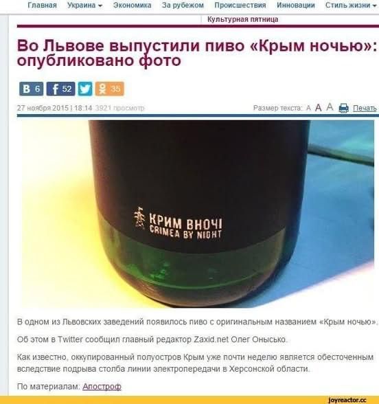 — 2015 год во Львове выпускается темное пиво «Крым ночью», названное в честь энергетической блокады Крыма после подрыва ЛЭП.