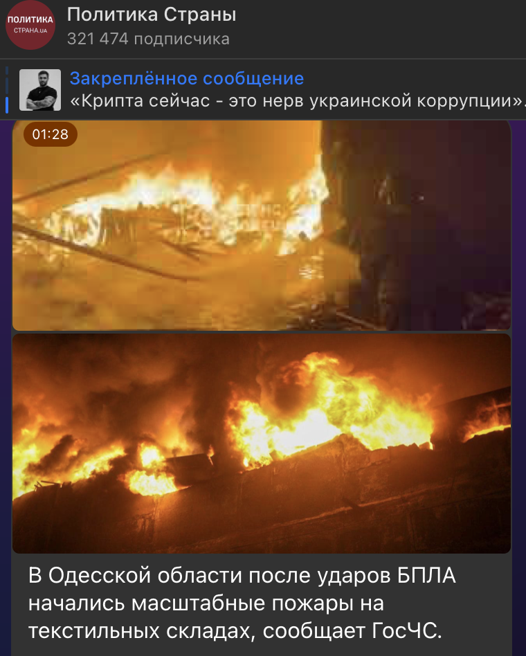 На Украине тоже неспокойно. В Одесской области после атак БПЛА начались крупные пожары на складах. Противник утверждает, что там хранился текстиль, но, видимо, русская разведка смогла выявить другие факты и "обнулила" хранящиеся в помещении запасы. Площадь возгорания превысила пять тысяч квадратных метров, также сгорел один автомобиль.