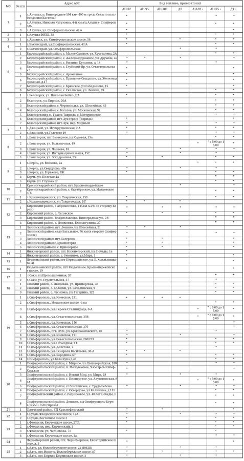Перечень адресов АЗС, где есть бензин, обновляется ежедневно утром. В целях равномерного распределения топлива в Крыму действует временное ограничение: не более 20 литров в одни руки в сутки. С 10 октября количество АЗС, отпускающих топливо по установленному нормативу (20 литров в одни руки в сутки), увеличено. С 20 октября число таких АЗС еще возрастет.