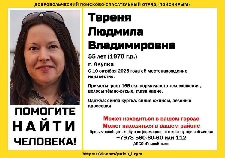 «Пропала Тереня Людмила Владимировна, 55 лет (1970 г.р.), город Алупка».