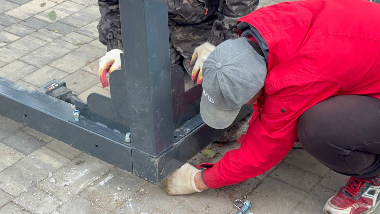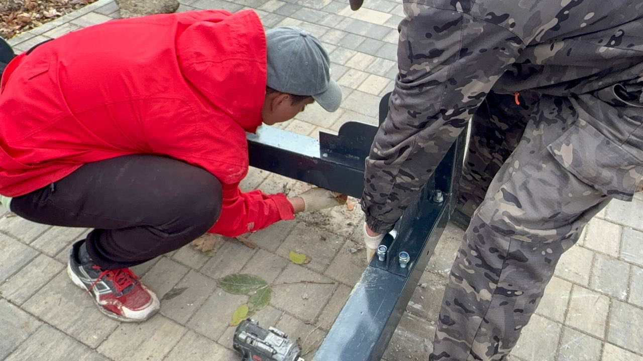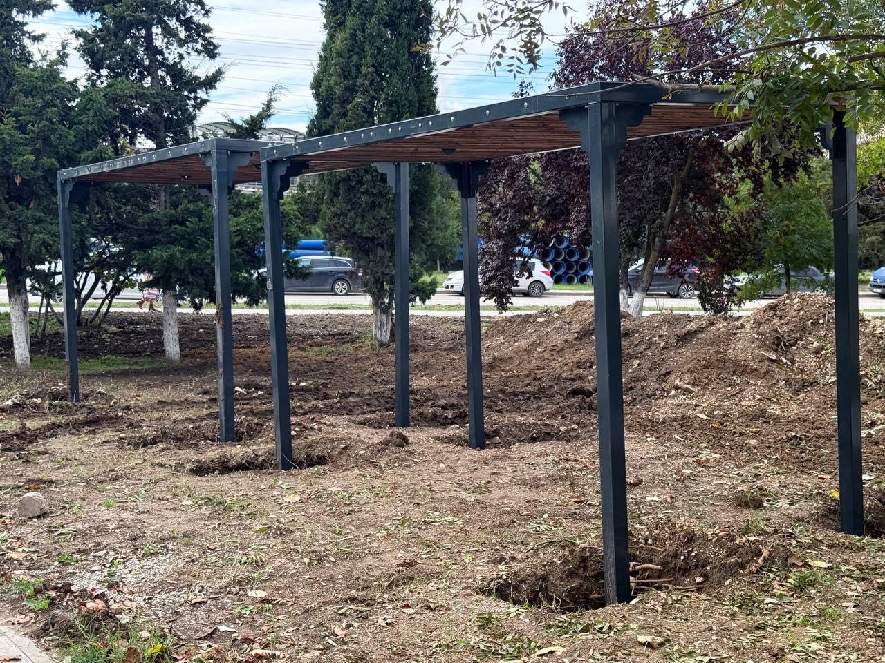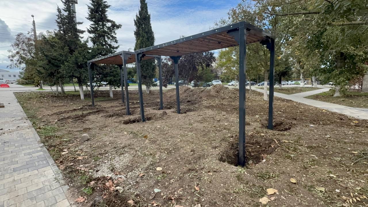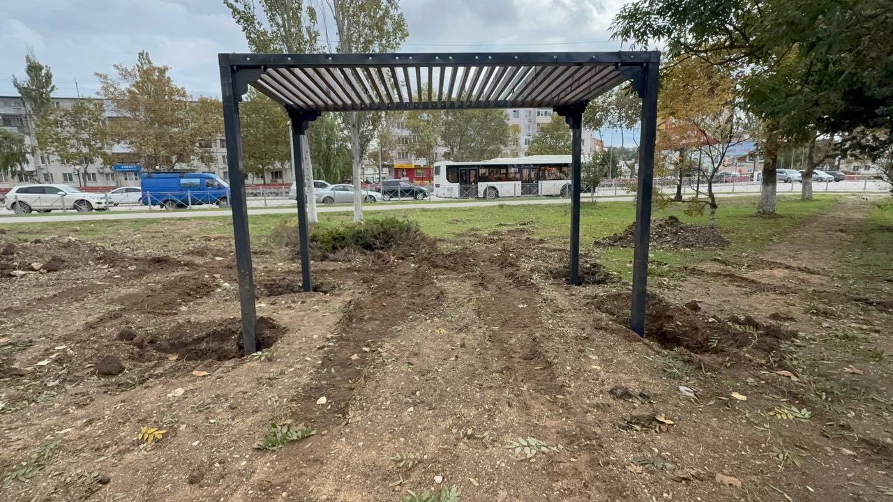 В сквере у Керченского РОЭ продолжается монтаж пергол. Всего 8 деревянных конструкций размером 4 на 2 метра установят на этой территории.