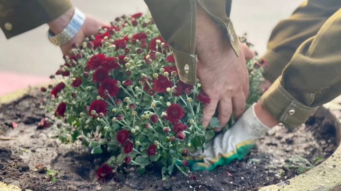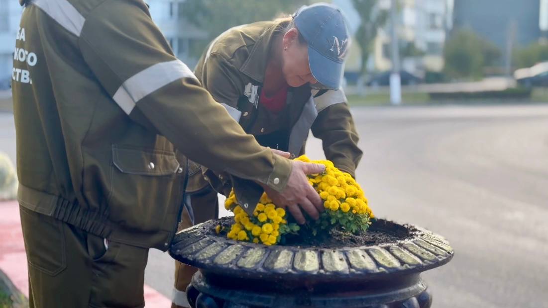Специалисты зеленхоза обновляют цветы в вазонах. Саженцы хризантем сегодня украсят клумбы вдоль ул. Чкалова, на Куоровском кольце. Также выполняется формовка кустарников.