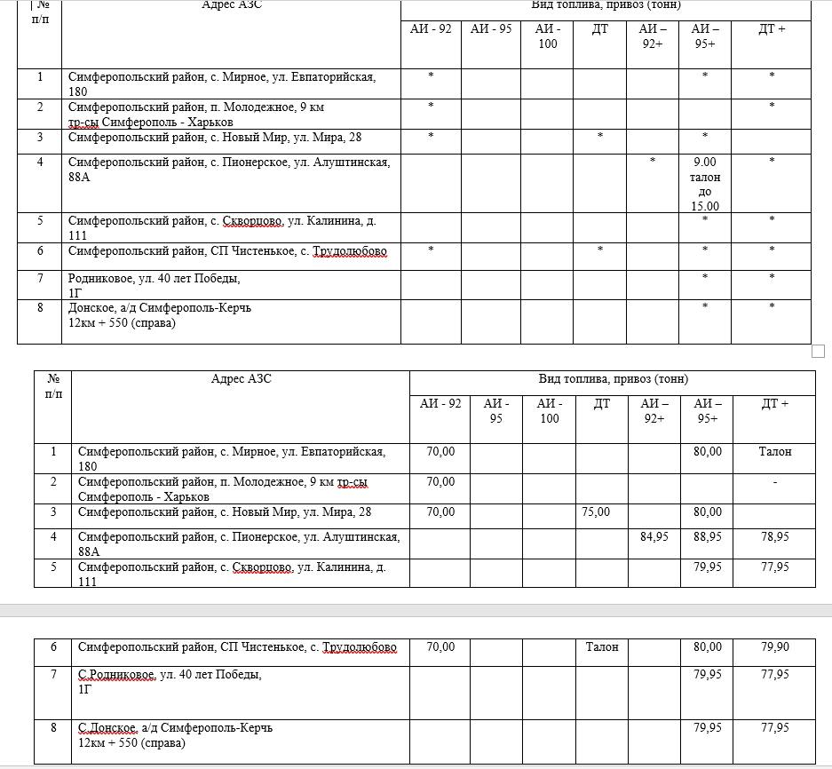 Публикуем информацию о наличии топлива на автозаправочных станциях расположенных на территории Симферопольского района реализуемого за наличный расчет.
