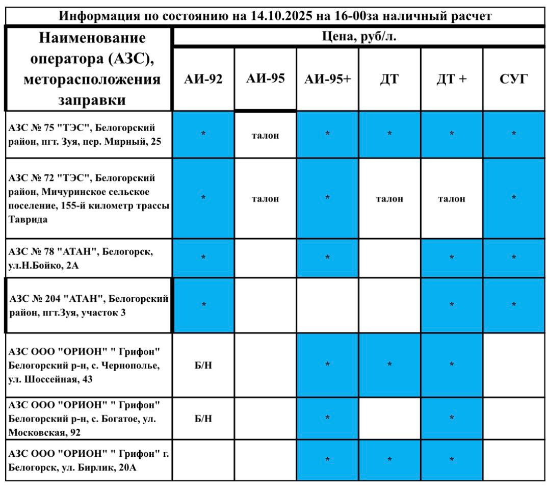 Актуальная информация по наличию топлива на АЗС в Белогорском районе по состоянию на 16.00 14 октября.