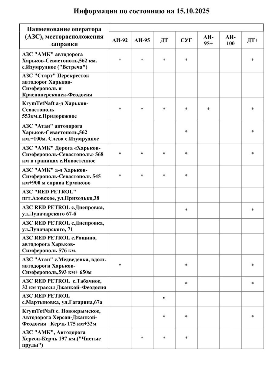 Делюсь с вами актуальной информацией о наличии топлива на АЗС Джанкойского района по состоянию на 15.10.2025 на 09:00