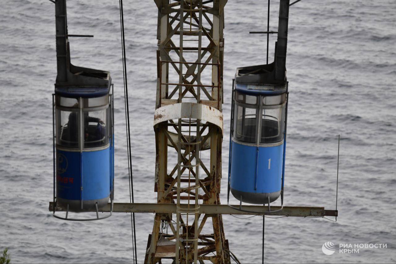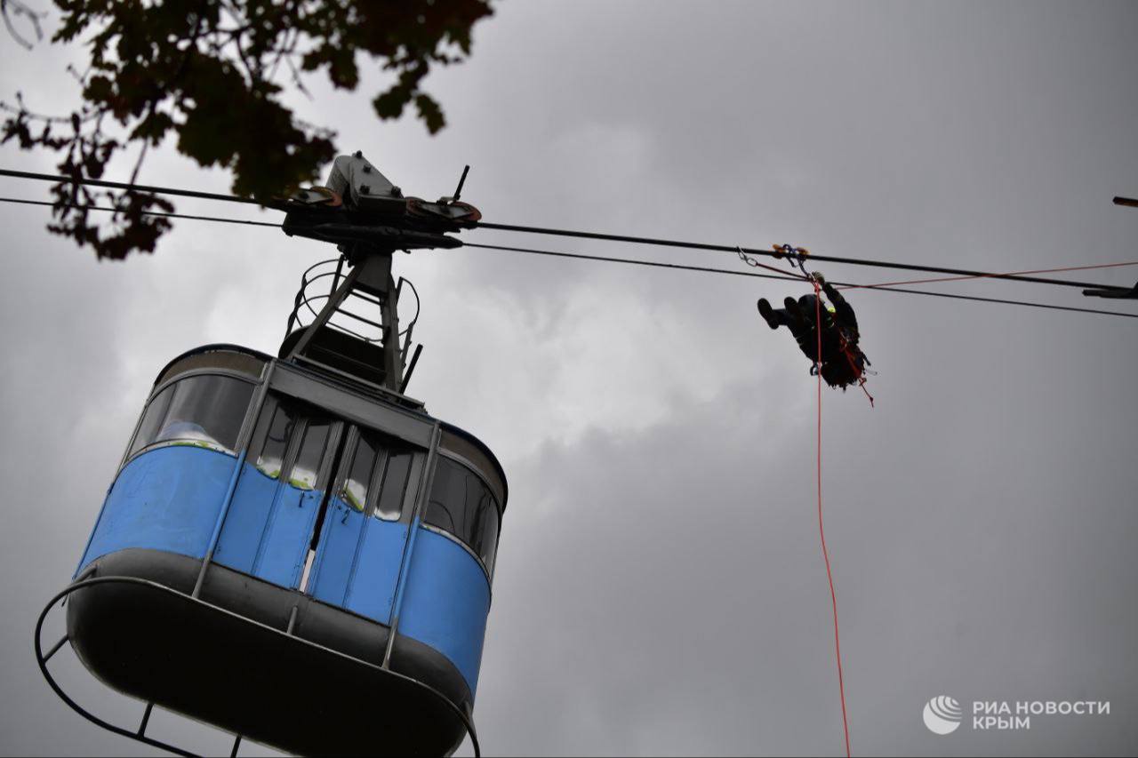 Крымские спасатели тренировались спасать людей из застрявшей кабины канатной дороги.