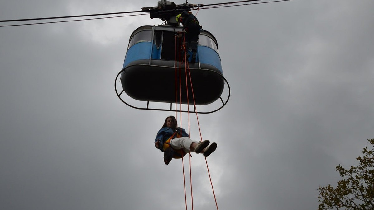 Сотрудники Ялтинского аварийно-спасательного отряда во взаимодействии с работниками канатной дороги отработали спуск условных пострадавших из зависшей кабинки при помощи альпинистского снаряжения. По сюжету, она остановилась из-за перебоев с электричеством, и в одной из кабинок, на высоте 15 метров, оказались два человека, которых необходимо было эвакуировать.