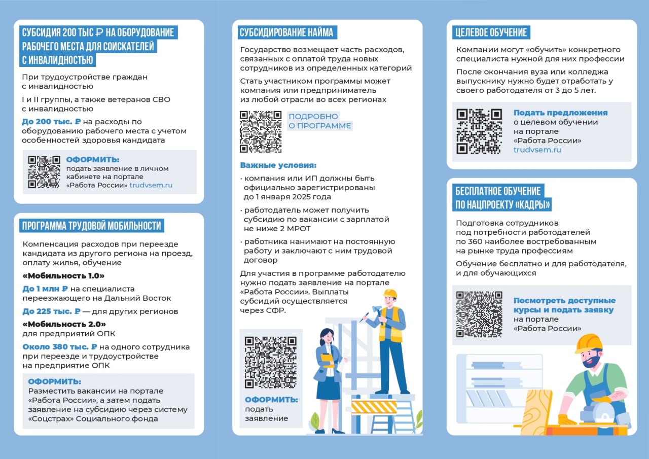 В целях реализации мероприятий федерального проекта «Активные меры содействия занятости» национального проекта «Кадры», направленных на содействие занятости населения, представляем информационные карточки о мерах государственной поддержки работодателей.