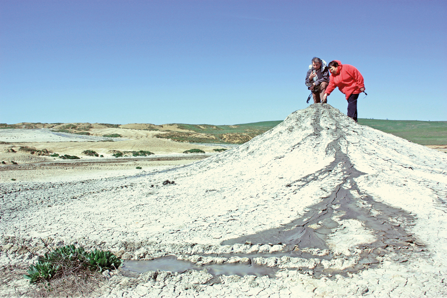 А простецкие холмики – точь-в-точь настоящие вулканы, только в миниатюре. Невысокий, до двух метров, конус венчает крохотный кратер. Неожиданно он начинает клокотать: газ, выходящий из недр, выталкивает, подобно лаве, холодную жидкую глину. Она переливается через край и медленно стекает по склону.