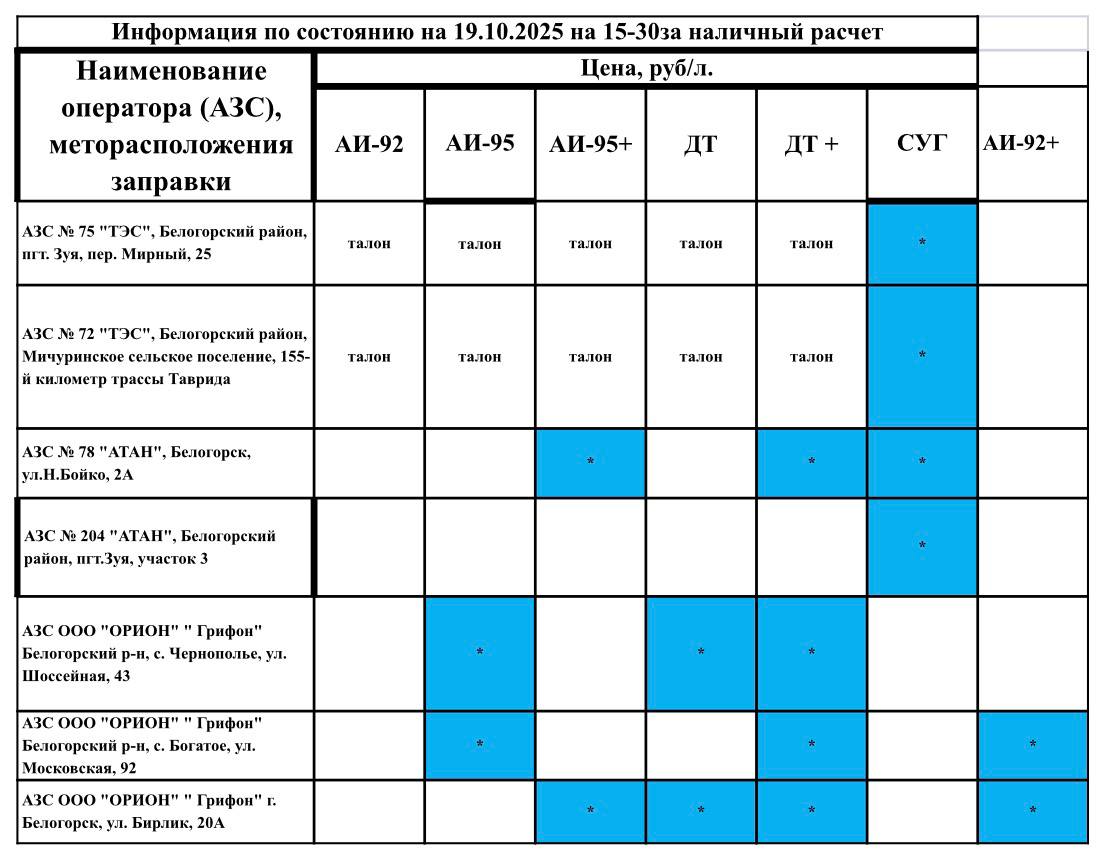 Актуальная информация по наличию топлива на АЗС в Белогорском районе по состоянию на 15.30 19 октября.