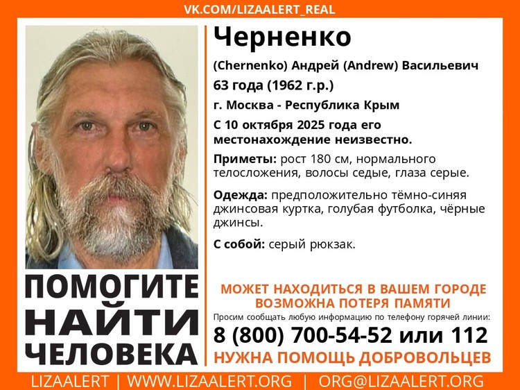«Пропал Черненко Андрей, 63 года, город Москва - Республика Крым».