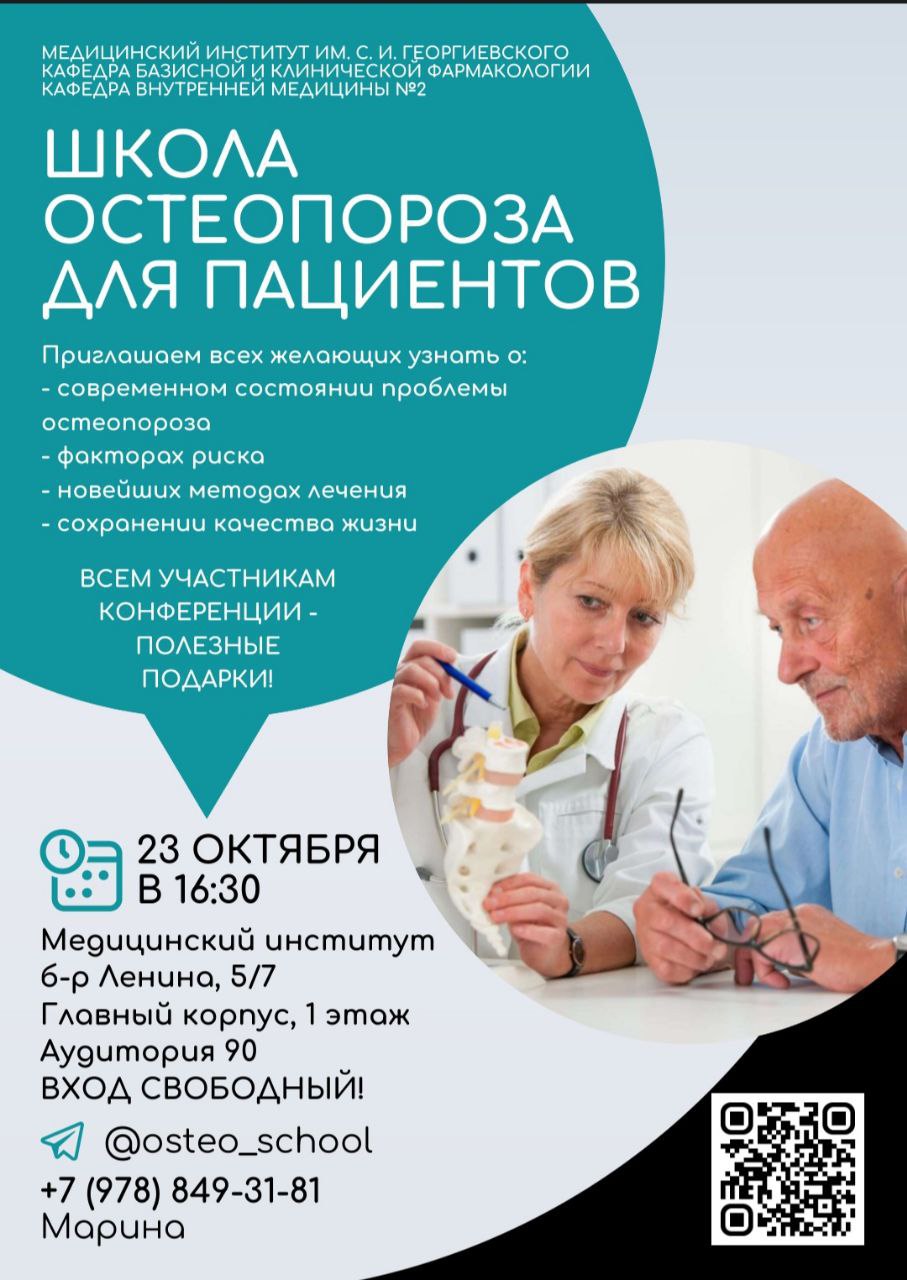 На мероприятие, организованное кафедрой базисной и клинической фармакологии и кафедрой внутренней медицины №2, приглашаются пациенты с остеопорозом и их близкие. На занятии будут освещены основные аспекты остеопороза, современные методы лечения и профилактики.