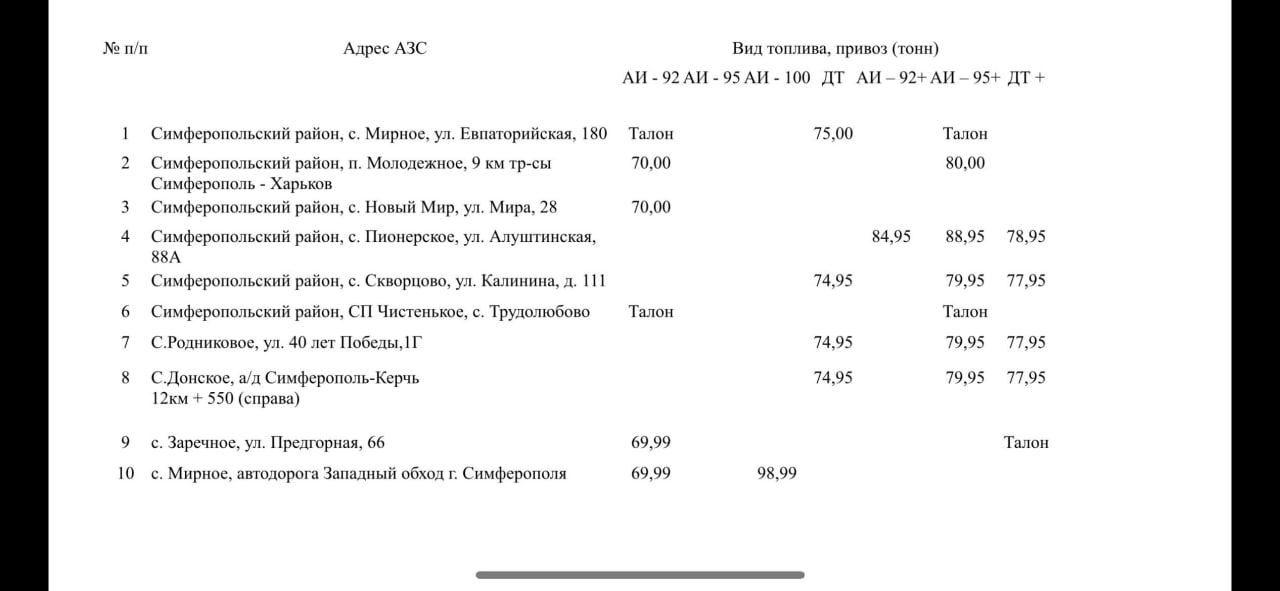 Продолжаем мониторить наличие топлива на автозаправочных станциях расположенных на территории Симферопольского района реализуемого за наличный расчет.