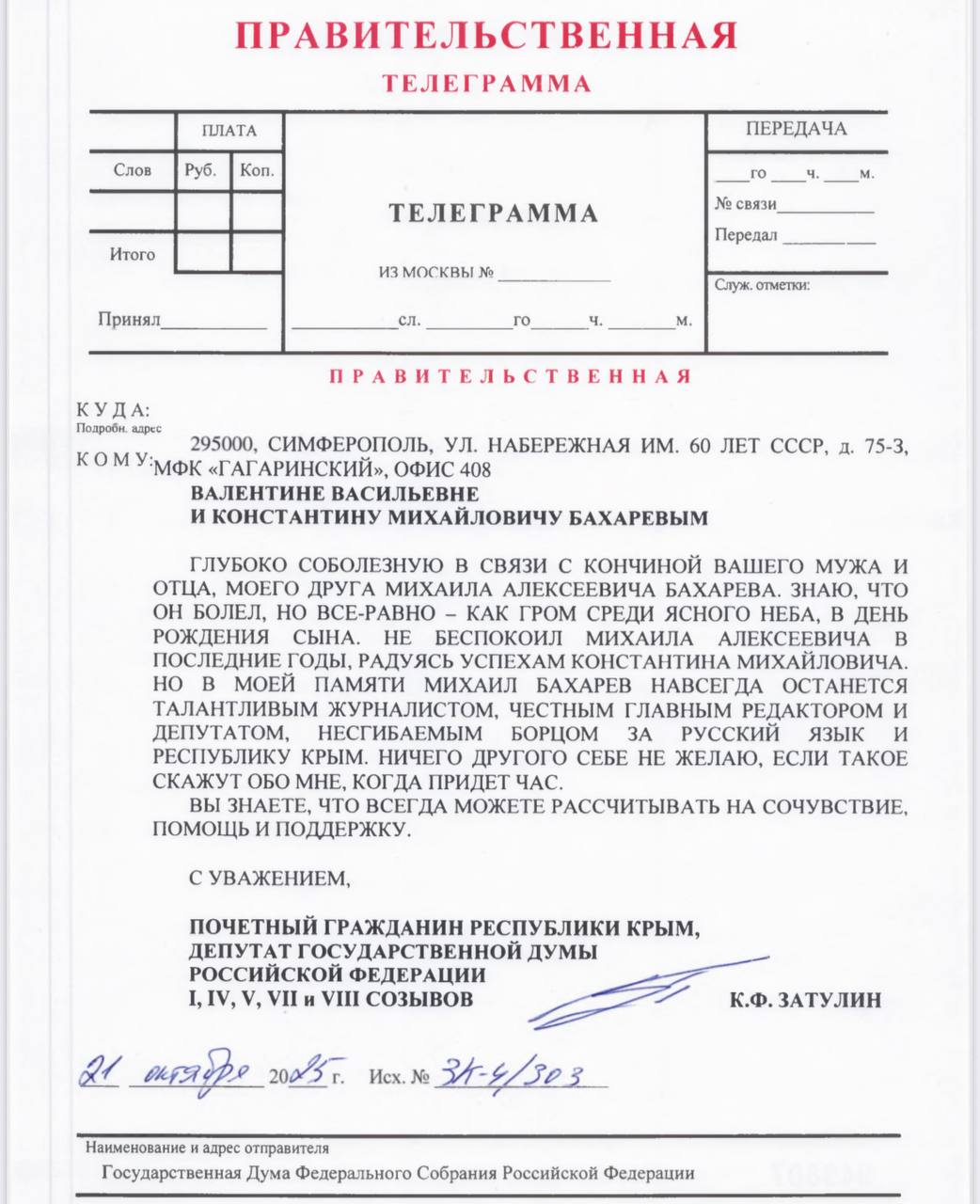Теперь все понимаю. Поздно вечером стало известно, что Михаил Алексеевич умер 20 октября, в День рождения сына. Это большое горе. Особенно для тех, кто помнит, что Михаил Бахарев был в годы украинского пленения учредителем «Русской общины Крыма» и всю жизнь боролся за права русского языка и русского человека. Его предавали, – это было, – но он всегда был верен русскому народу, Крыму и России. И завещал свои принципы сыну, заменявшему его, – время от времени, а затем постоянно, – в редакции «Крымской правды» и на депутатской трибуне. Светлая память.