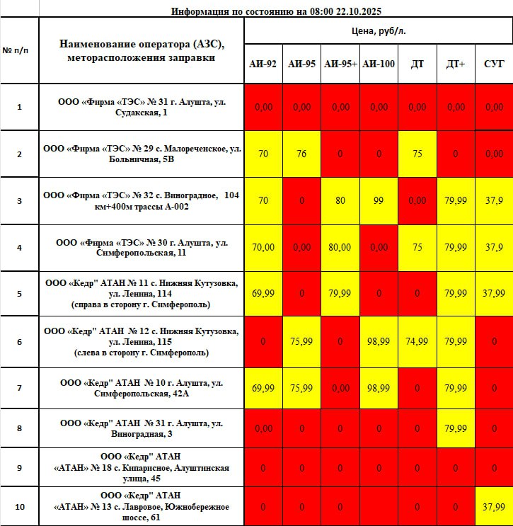 Уважаемые алуштинцы! Важная информация о наличии топлива в нашем муниципалитете по состоянию на 08:00 22.10.2025.