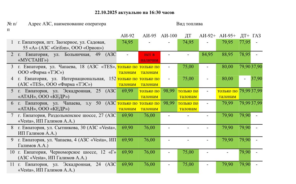 Публикуем данные о наличии топлива на АЗС Евпатории.