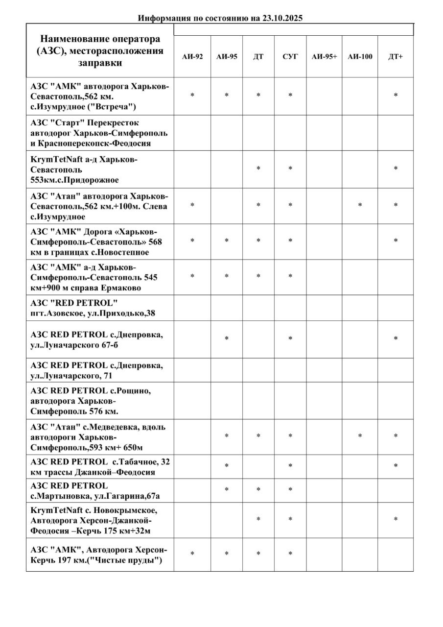 Делюсь с вами актуальной информацией о наличии топлива на АЗС Джанкойского района по состоянию на 23.10.2025 на 09:00