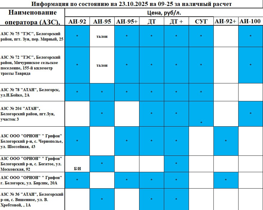 Актуальная информация по наличию топлива на АЗС в Белогорском районе по состоянию на 09.25 23 октября.