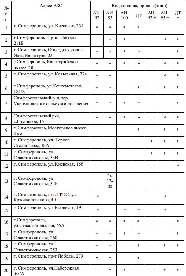 Актуальный перечень адресов АЗС в городе Симферополе, где имеется топливо в свободной продаже (*Данные актуальны на 23.10.2025 года 08:00)