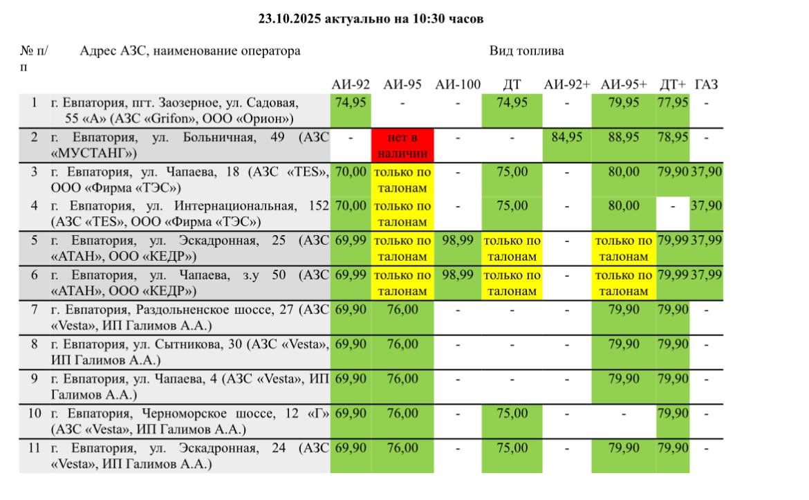 Публикуем данные о наличии топлива на АЗС Евпатории.